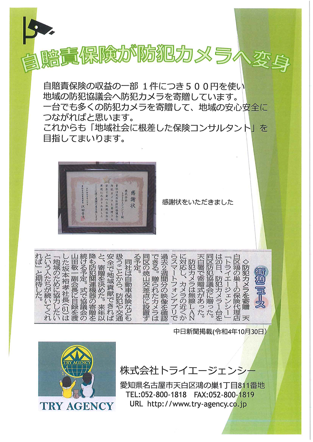 トライエージェンシーの地域貢献活動の一環として天白区防犯協議会様に防犯カメラ1台を贈りました。(天白区焼山交差点に設置)